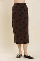 Step into festive style with the Holiday Cocoa Midi Skirt! This brown linen skirt with black polka dots features a stretchable waistband for comfort and a flattering fit. Perfect for holiday parties, winter brunches, or cozy seasonal outings—pair with heels or boots for an effortlessly chic look.