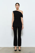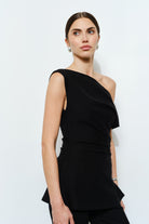 Turn heads effortlessly in this off-the-shoulder black shirt. Made with 5% spandex for a comfortable, flattering stretch, it falls long below the hip and features waist ruching to accentuate your silhouette. Dress it up with tailored pants or a skirt, or keep it casual with jeans for an effortlessly stylish look.