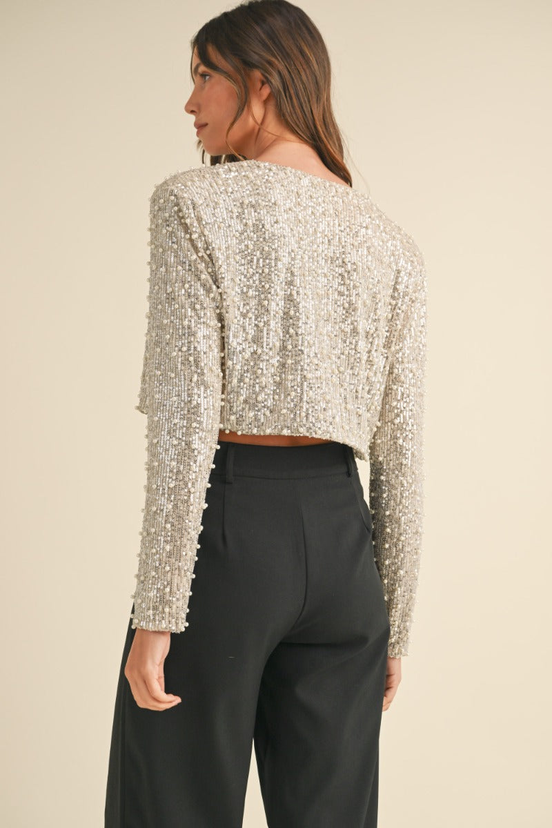 Dare to dazzle in the Norma Shimmering Pearl Bow Tied Crop Jacket with its lustrous pearl and sequin embellishments. Featuring long sleeves, this jacket is perfect for those who love a little risk and adventure in their fashion choices!