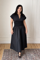 Elevate your everyday elegance with this timeless black midi dress. Designed with a flattering v-neckline and cinched waist that beautifully defines your silhouette, this dress features short sleeves and a flowing skirt that moves gracefully with you. Crafted from 100% cotton for breathable comfort with contrast panels in a soft rayon-spandex blend, this true-to-size midi dress effortlessly transitions from day to night. The classic black hue and versatile midi length make it a wardrobe essential you'll reach for season after season.