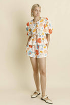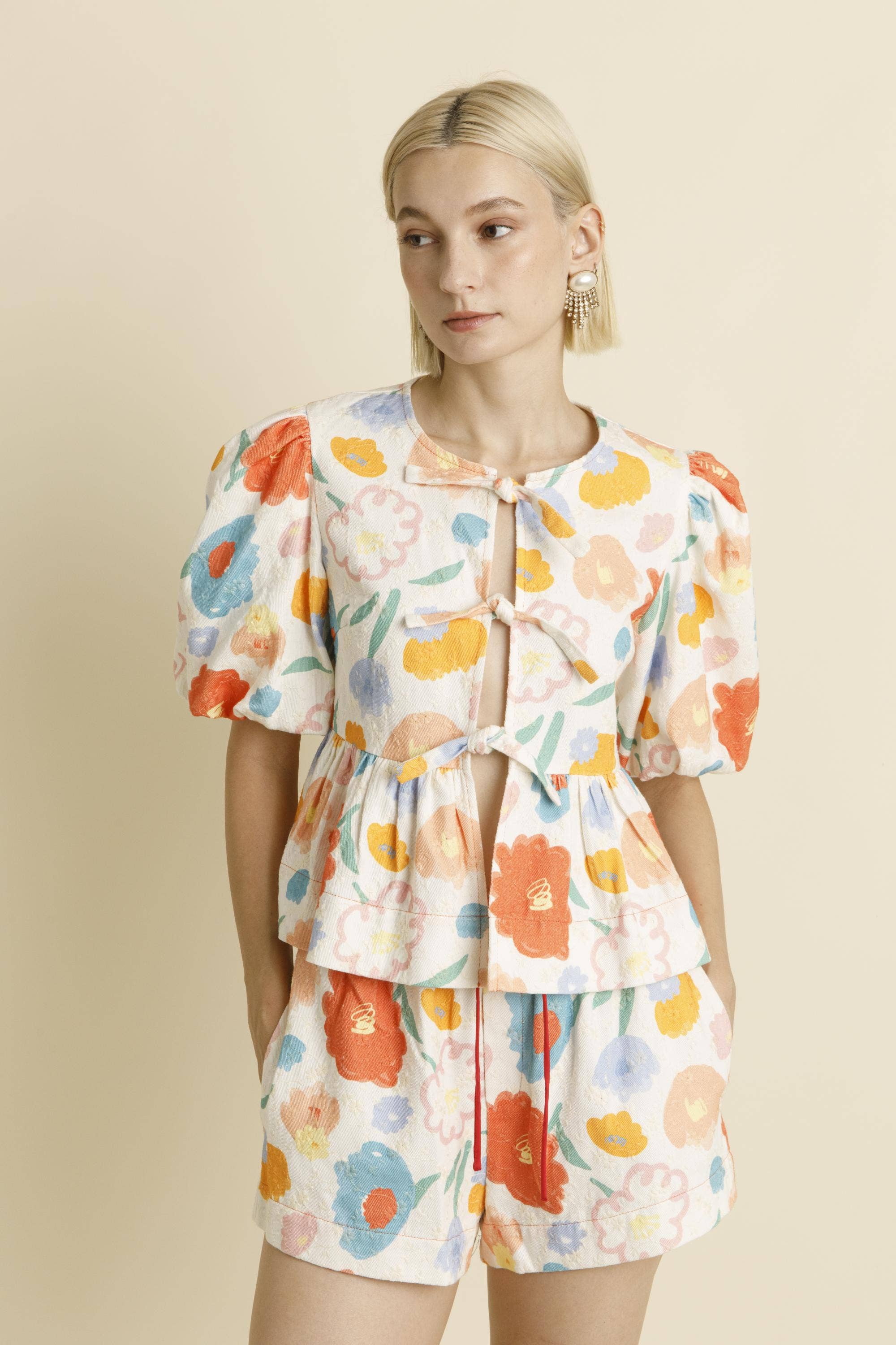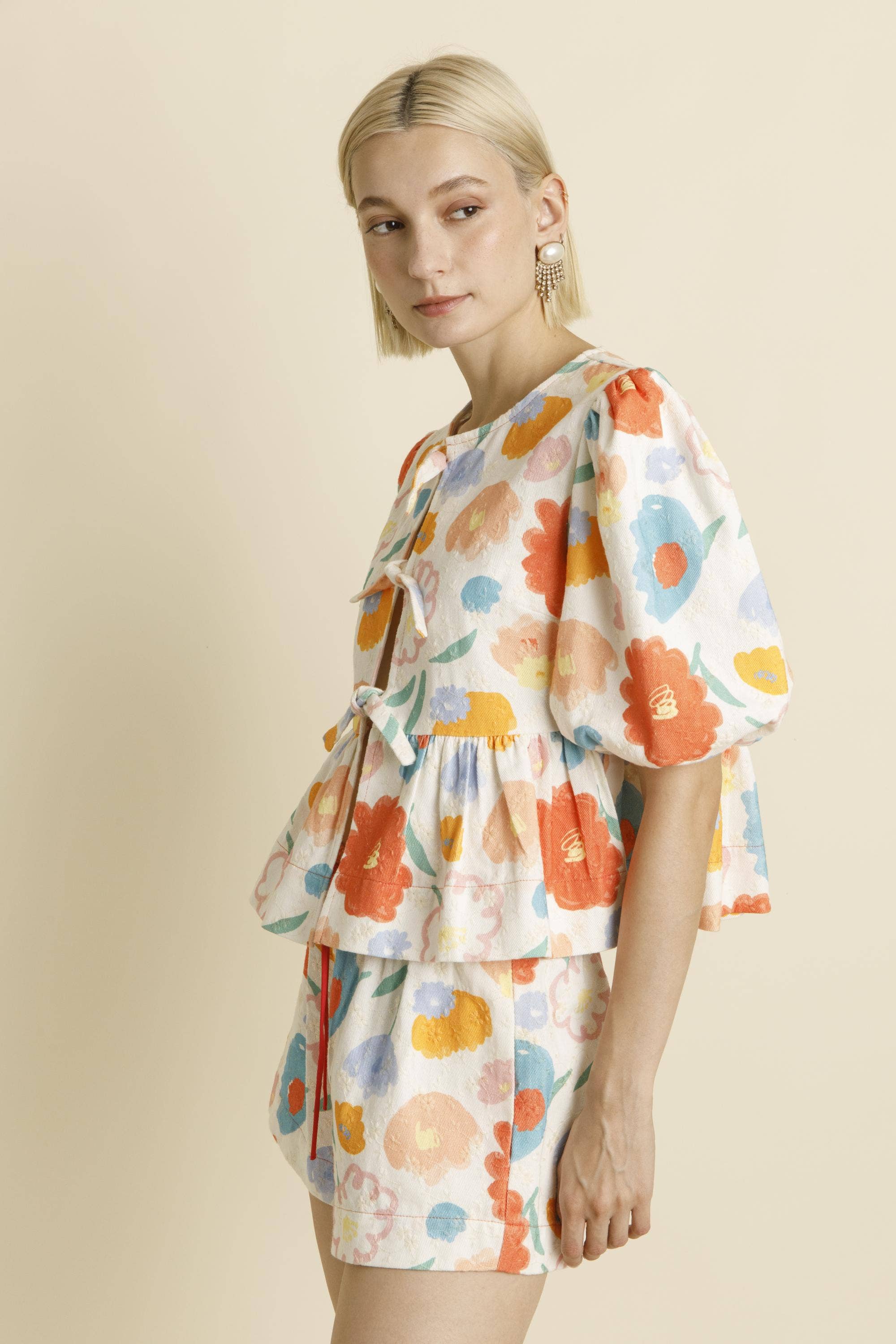 This top is made with non-stretch cotton twill, featuring beautiful tonal embroidery throughout. The front ties add a charming detail, and the elasticated bubble sleeves create a flattering fit. Available in multiple sizes, including XS. Feel confident and stylish in this unique and versatile floral top.