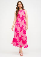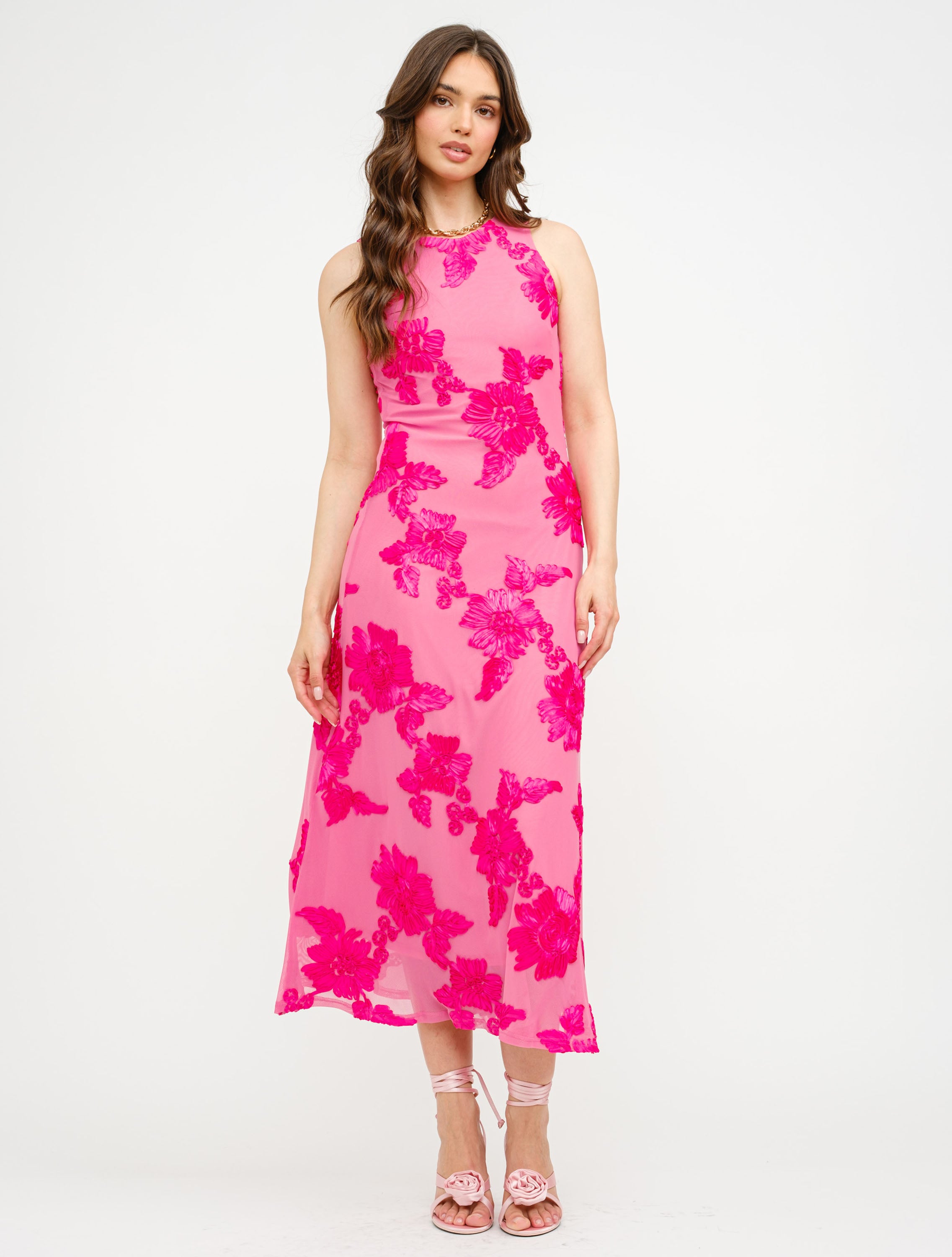 Step into elegance with our Floral Embroidered Mesh Tank Midi Dress, a bold yet feminine piece designed to make an unforgettable impression. Featuring a sheer mesh overlay with vibrant hot pink floral embroidery, this body-skimming midi dress offers a romantic silhouette that flatters every curve. The sleeveless tank-style bodice and high neckline add a modern touch, while the intricate floral detailing makes it perfect for weddings, garden parties, or special events.