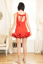 Elevate your style with our Jackie Ballon Hem Dress/Romper. This versatile piece features a stunning red color, a flattering ballon hem, and a tie back for a customizable fit. Perfect for both formal and semi-formal occasions, this dress/romper effortlessly combines comfort and style for an unforgettable look.