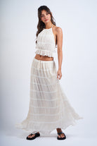 Experience the ultimate in summery, effortless vibes with the Janelle Coastal Breeze Set. This two piece set features a beautiful light blue hue or beige that evokes images of a peaceful coastal escape. The long skirt and top create a flowing and romantic silhouette that will make you feel elegant and carefree. Embrace the power of effortless style with the Janelle Coastal Breeze Set.