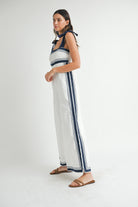Crafted from a breathable blend of 55% linen and 45% rayon, it offers lightweight comfort and a soft, flowy feel you’ll love. The adjustable tie straps add a feminine touch, while the navy contrast trim and side stripes create a timeless, flattering look.
