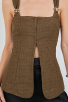 Elevate your style with our Metal Trim Accent Corset Tweed Top in Olive – the perfect blend of chic structure and modern femininity. Designed in a flattering corset silhouette, this top features sleek metal trim accents that add just the right amount of edge to a timeless tweed fabric. The rich olive hue makes it a versatile statement piece that transitions effortlessly from day to night.