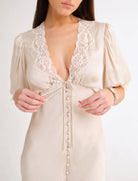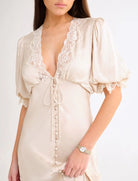 The lace-trimmed V neckline, fabric-covered buttons, and dainty micro ties add delicate, romantic details that make this dress unforgettable. Perfect for weddings, date nights, garden parties, or anytime you want to feel dreamy and elegant