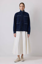 Elevate your outerwear game with this Embroidered Collar Denim Jacket in a versatile dark denim tone. Made in Turkey from high-quality denim, this jacket combines a structured silhouette with artisan-inspired details like contrast hand-stitch embroidery at the collar, pockets, and cuffs. Featuring a stand-up collar with subtle frill trim, four large front pockets for utility, and a hidden button placket, it’s the perfect blend of function and elevated street style. Pair it with denim trousers or neutral-toned separates for a statement casual look. Ideal for transitional seasons.