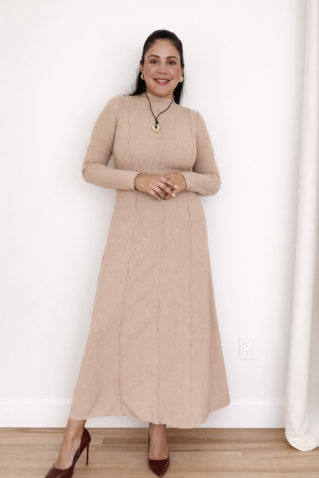 silhouette and gently flared skirt. The high-quality, knitted