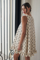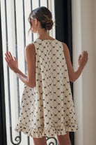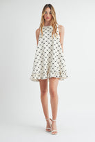 Take a risk and stand out in this fearless black bow textured mini dress with a flocking pattern. The ruffle hem and high neck line add an element of adventure to this cream-colored, sleeveless dress